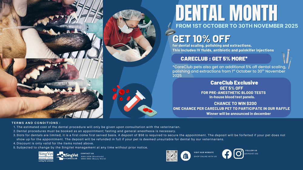 Best in SingaporeAt Singvet, we believe in providing quality service for you and your pet. This involves hiring quality employees, purchasing necessary equipment and medications. We can only continue to maintain such care and services if we receive prompt payment for the services rendered. We have a no credit policy and all outstanding invoices have to be paid upon discharge. This includes all in-hospital patients, surgeries and upon completion of all out-patient consultations.